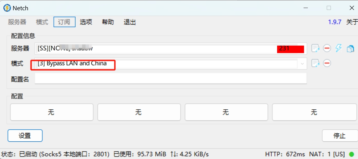 根据你自己的节点配置好服务器(跟你前面科学上网的工具配置方式一样),模式选择看截图,选Bypass LAN China